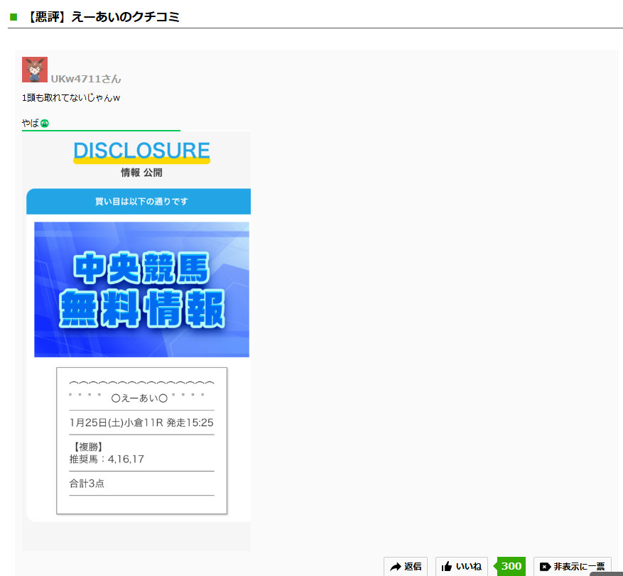 必ず導くとサイト上で言っていましたが、この結果を見ると全然導いてくれない予想サイトですので【悪評】で十分だと思います。