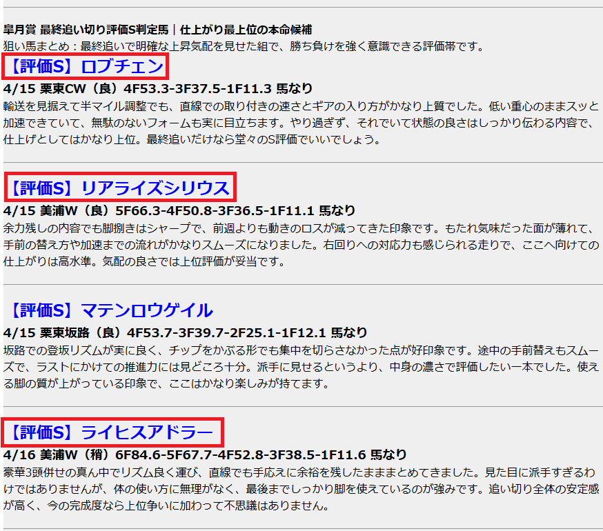 最終追切記事では評価Sに置いたロブチェンが1着、アライズシリウスが2着、ライヒスアドラーが3着と、上位をきれいに形成しました。