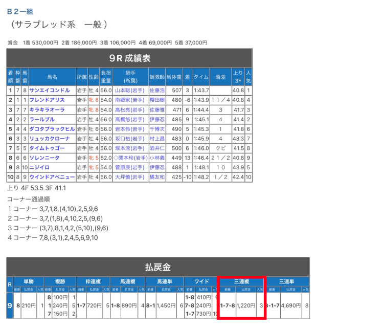 この的中は素晴らしいですね。1番人気の⑮ハルオーブが本命でしたが、人気薄7番人気の⑧グランドカリナンが勝ってくれて万馬券の決着になったので感謝したいです。