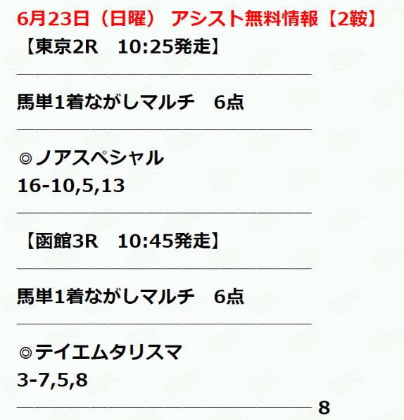 気を取り直して、日曜日に公開されていた買い目がこちらになります。