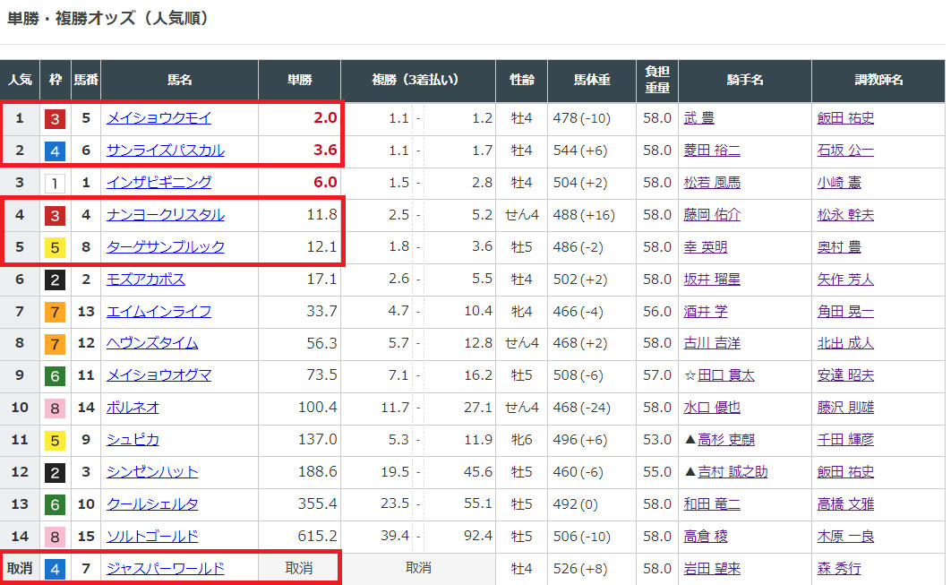 選んだ馬のオッズを見てみると