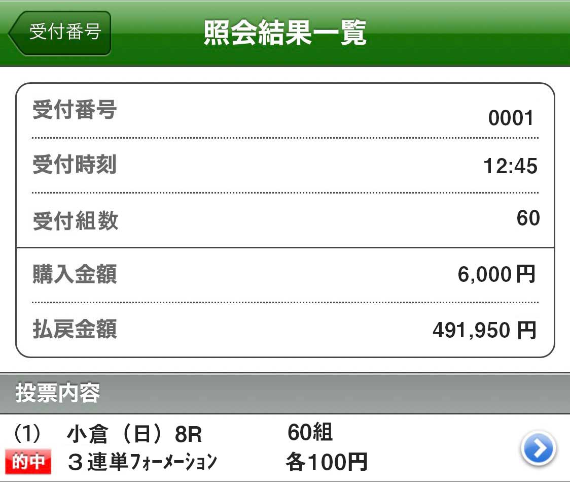 3連単にしては点数は多いけど、1点100円、点数60点、馬券代6千円で3連単4919.5倍当たるなら俺は全然ありだね、俺の師匠である競馬を教えてもらった友達に的中写メ自慢したら40万馬券なんて100点あっても足りない、絶対取れんって言ってた(笑)