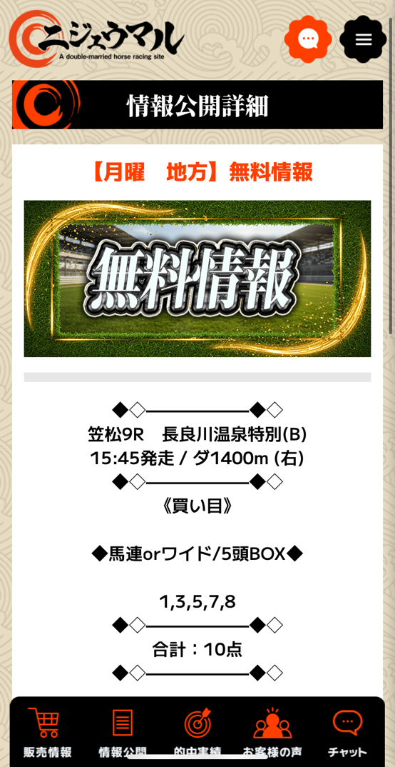 ニジュウマルの無料予想&有料予想ダブルで的中貰えました!