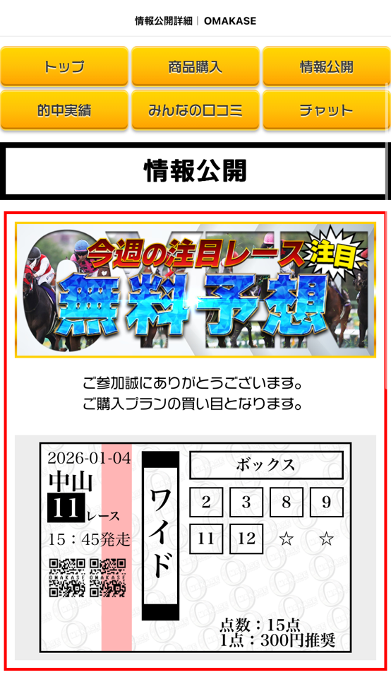 運営さんも人間だから間違える事はあると思う。 ワイド5頭だと15点じゃなくて10点ですよ(笑) 点数は間違えてるけど買い目はドンピシャ! 2026年を占う中山金杯、その無料予想で 1着~3着ドンピシャ! これなら3連単456倍も付いたから買っておけばよかった 来週はフェアリーステークス出すみたいだから重賞的中頼んだ! 次は3連単も買う!
