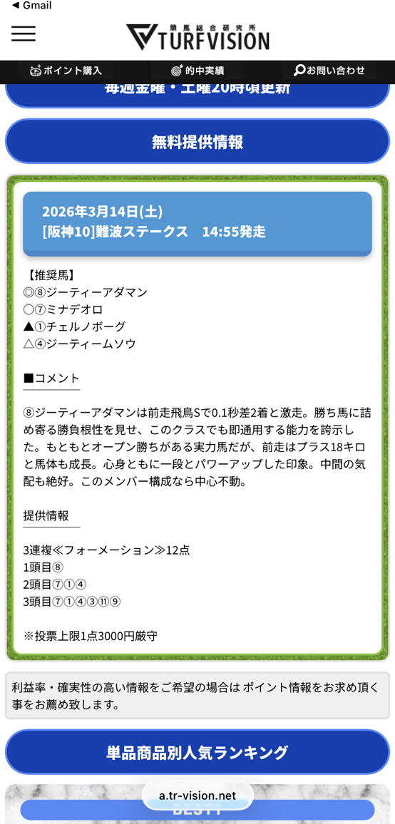 このサイトの点数を絞ったのと、圧張り予想が好きでよく多様しています、先週も安定の7万4700円的中で満足のいく結果をもらえました。